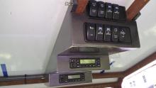 The final wiring setup includes a fuse box above the console, that is powered by a heavy solenoid relay at the battery, controlled by the key. This brings both radios, and the switch panel alive when the key is turned on. Antennas are mounted either side of the front basket using mirror mount NMO brackets. Both antennas are no-ground-plane antennas.
